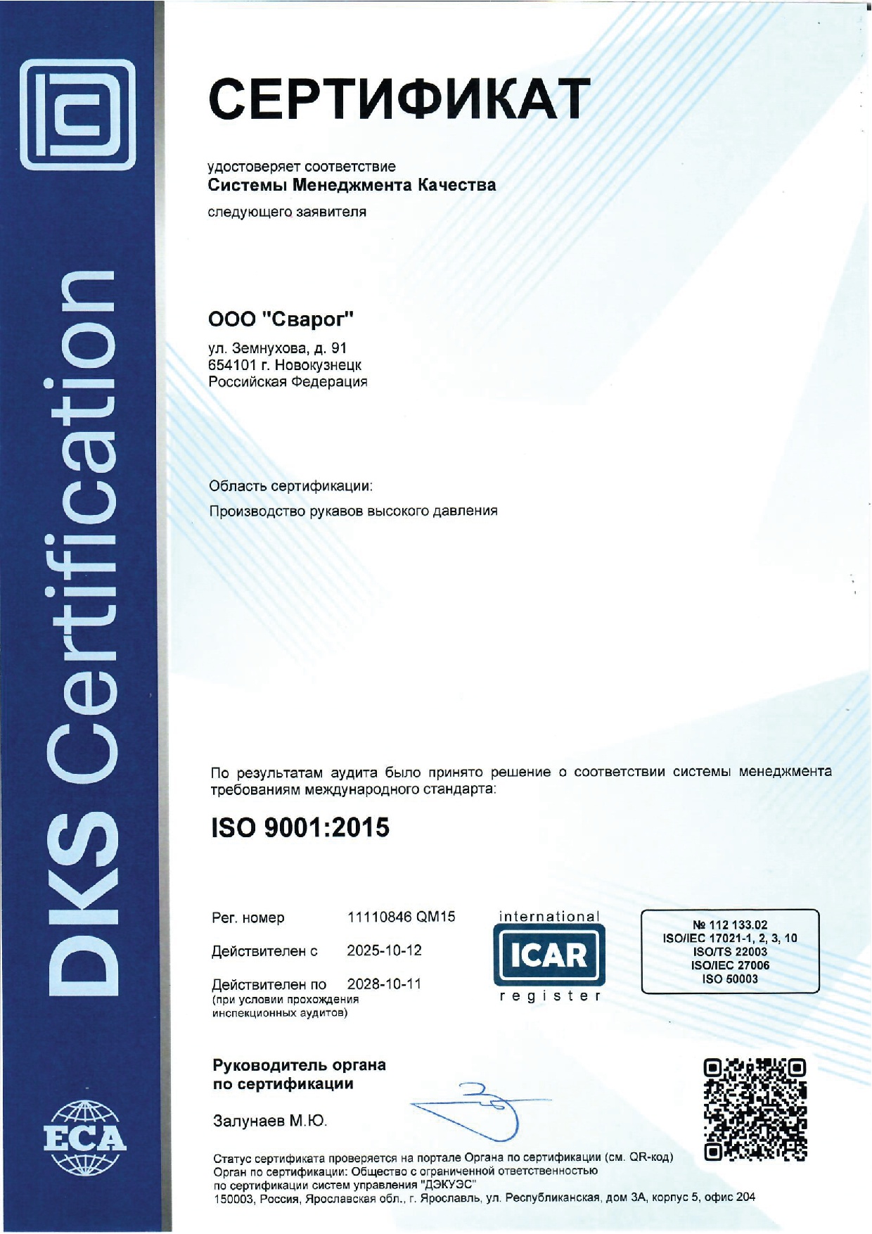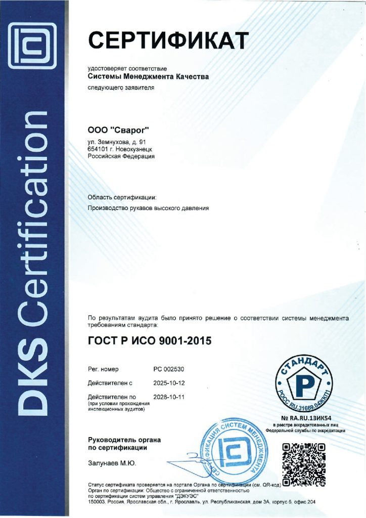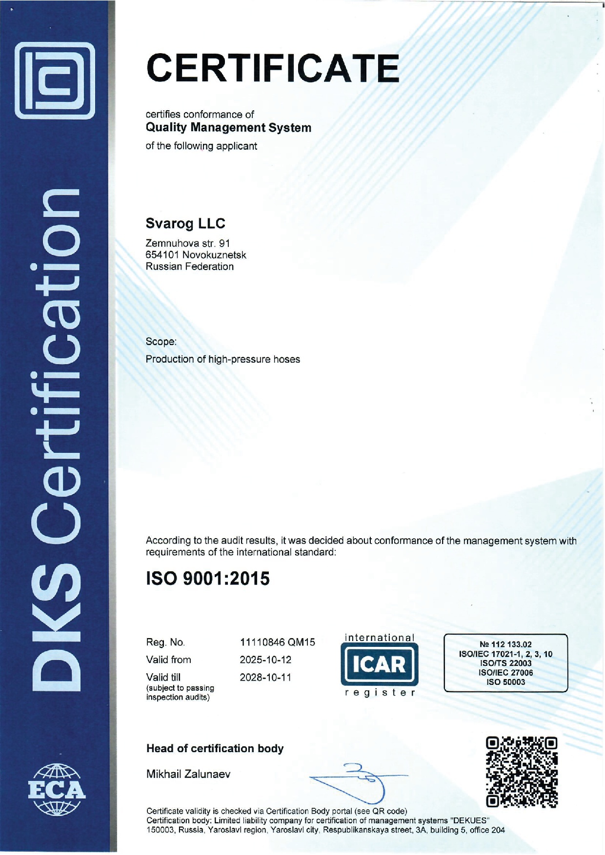Добровольный Сертификат соответствия в Системе сертификации ГОСТ Р выданный Органом по сертификации продукции и услуг ООО «МФЦС» гарантирует соответствие РВД произведенным ООО «Сварог» по EN 856 требованиям ГОСТ 25452-2017.